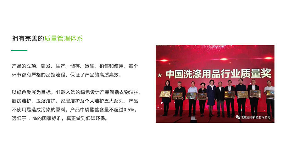 2018年11月,以綠色發(fā)展為目標(biāo)的41款綠傘產(chǎn)品入選綠色設(shè)計(jì)產(chǎn)品。這些產(chǎn)品均不使用易造成污染的原料,磷酸鹽含量不超過0.5%,遠(yuǎn)低于1.1%的國家標(biāo)準(zhǔn),真正做到低碳環(huán)保。同年,綠傘榮獲中國洗滌用品工業(yè)協(xié)會(huì)頒發(fā)的“中國洗滌用品行業(yè)質(zhì)量獎(jiǎng)”,這一獎(jiǎng)項(xiàng)的頒發(fā)充分肯定了綠傘一直以來嚴(yán)把質(zhì)量關(guān)、綠色環(huán)保的發(fā)展戰(zhàn)略。
