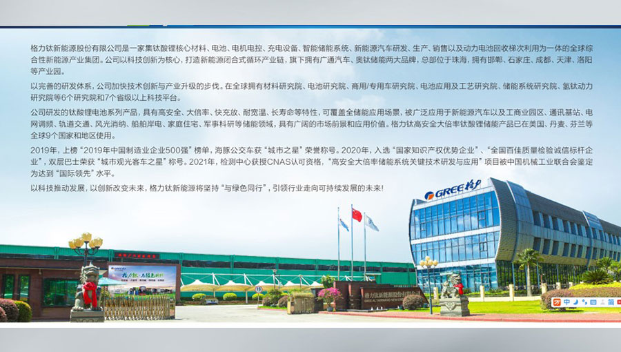 格力鈦新能源股份有限公司是一家集鈦酸鋰核心材料、電池、電機(jī)電控、充電設(shè)備、智能儲能系統(tǒng)、新能源汽車研發(fā)、生產(chǎn)、銷售以及動力電池回收梯次利用為一體的全球綜合性新能源產(chǎn)業(yè)集團(tuán)。格力鈦以科技創(chuàng)新為核心,打造新能源閉合式循環(huán)產(chǎn)業(yè)鏈,旗下?lián)碛袕V通汽車、奧鈦儲能兩大品牌,總部位于珠海,擁有邯鄲、石家莊、成都、天津、洛陽、南京等產(chǎn)業(yè)園。