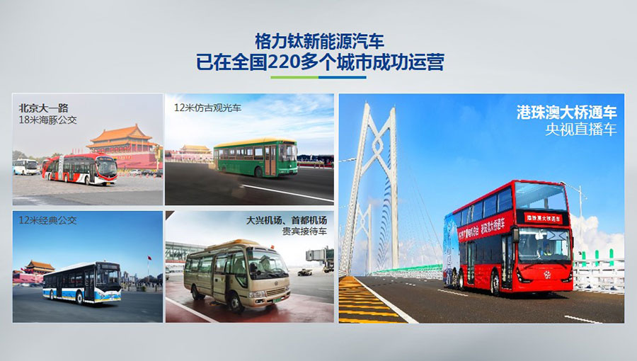 目前,格力鈦生產(chǎn)的新能源汽車于北京、杭州、武漢、青島、哈爾濱、包頭、海口等全國220多個城市運(yùn)營。2014年,仿古鐺鐺車榮膺第22屆北京APEC會議官方指定用車、登陸北京環(huán)天安門旅游觀光線;2016年,雙層巴士榮膺第二屆中美低碳峰會指定用車、登陸國內(nèi)首條純電動雙層觀光車線路——北京城市旅游觀光3線;2017年,18米海豚公交車投入北京長安街1路運(yùn)營;2018年,港珠澳大橋正式通車,雙層巴士擔(dān)綱中央廣播電視總臺直播車,成為首輛駛上港珠澳大橋的大巴車。