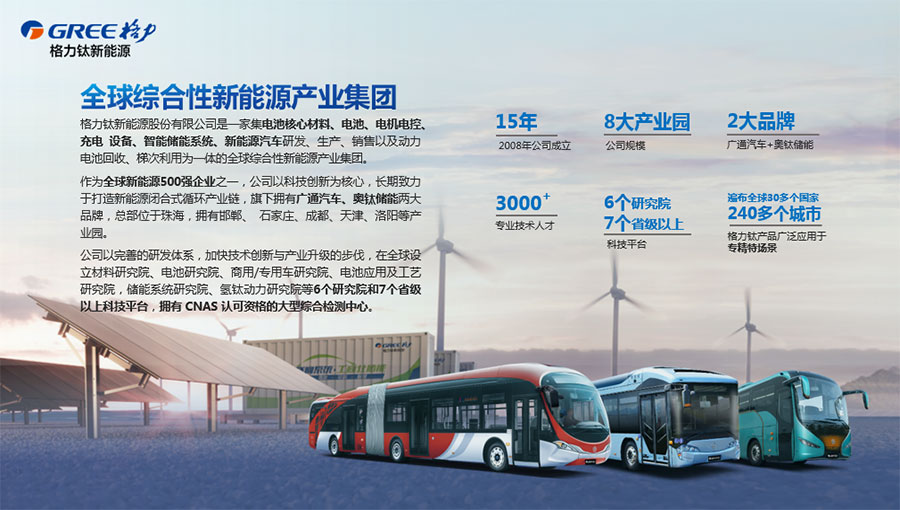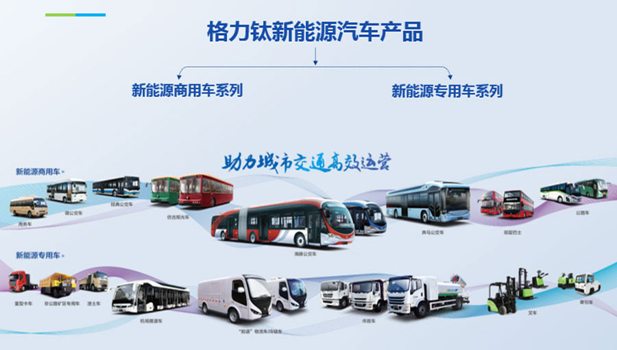 格力鈦新能源股份有限公司一直致力于研發(fā)混合動力、氫燃料、純電動車等一系列節(jié)能減排的新能源環(huán)保型客車/公交車/物流車,所研制產(chǎn)品體現(xiàn)了電子化、智能化、綠色化、節(jié)能化的鮮明特色,堅持以產(chǎn)品開發(fā)和市場開拓相結(jié)合的經(jīng)營方針,引進國外先進客車生產(chǎn)技術(shù),力爭通過資本、技術(shù)及產(chǎn)業(yè)優(yōu)勢,做大區(qū)域市場,進軍國際市場,力爭成為中國新能源汽車的領(lǐng)軍企業(yè)集團。