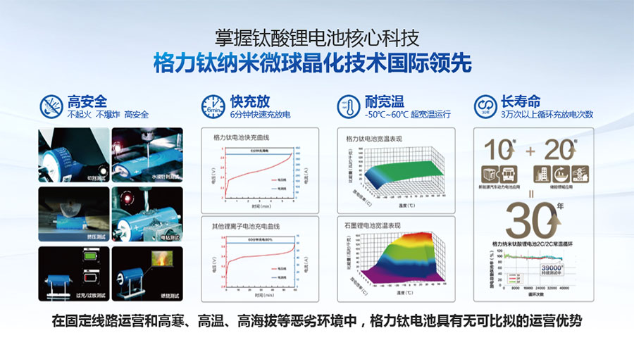鈦酸鋰電池技術(shù)是新能源行業(yè)唯一獲得中國專利獎金獎的鋰電池產(chǎn)品技術(shù),其應(yīng)用于儲能電池和動力電池具有超高安全性,在快充放、耐寬溫、長壽命等方面同樣具有卓越的性能。格力鈦電池系列產(chǎn)品具有不起火不爆炸高安全、6分鐘快充放、-50℃至60℃耐寬溫特性,循環(huán)充放電次數(shù)高達30000多次,使用壽命長達30年。格力鈦電池經(jīng)利鋸切割、尖針穿刺、強力擠壓、電鉆沖孔、短路充放電、高溫加熱、槍擊等極限條件測試,均未發(fā)生冒煙、起火、燃燒、爆炸等現(xiàn)象。
