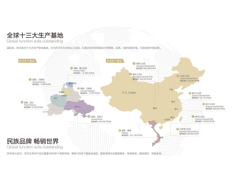 在全球設(shè)有多家子公司、分公司及關(guān)聯(lián)公司,運(yùn)營網(wǎng)絡(luò)橫跨亞、美、歐、澳四大洲,擁有超過8000個銷售終端,產(chǎn)品暢銷中國、美國、英國、加拿大等100多個國家及地區(qū),旗下“CHEERS”、“芝華仕”和“頭等艙”品牌專賣店超過8000家,形成了體系完備的全球跨國發(fā)展大格局,已成為集研發(fā)、制造、銷售和服務(wù)于一體的國際化智能家居企業(yè)。