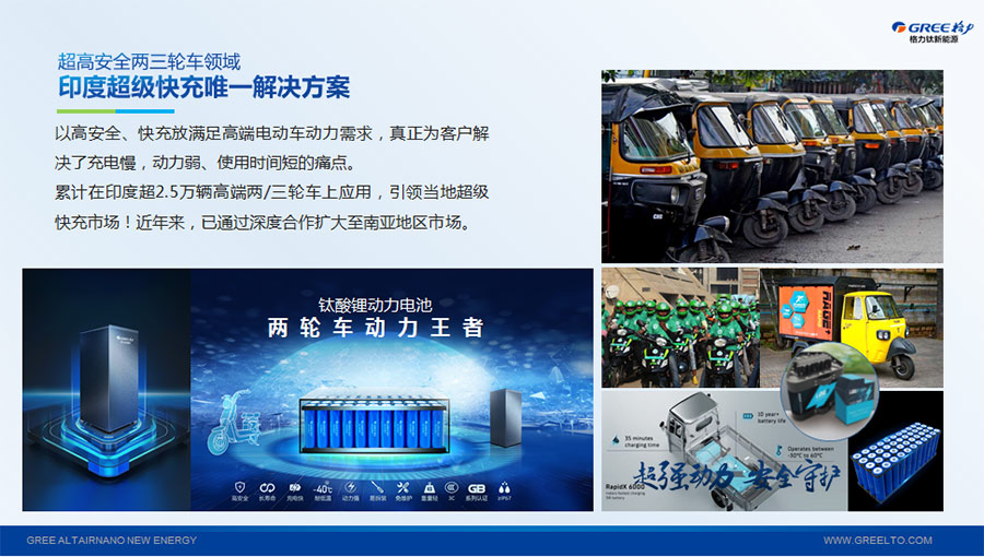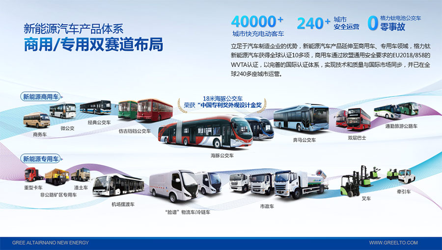 以完善的研發(fā)體系,格力鈦加快技術(shù)創(chuàng)新與產(chǎn)業(yè)升級的步伐。格力鈦研發(fā)的格力鈦電池安全性長期領(lǐng)跑行業(yè),憑借具有高安全、大倍率、快充放、耐寬溫、長壽命等特性,被選為“國家制造業(yè)單項(xiàng)冠軍產(chǎn)品”,廣泛應(yīng)用于新能源汽車以及工商業(yè)園區(qū)、通訊基站、電網(wǎng)調(diào)頻、軌道交通、風(fēng)光消納、船舶岸電、家庭住宅、軍事科研等儲能領(lǐng)域,具有廣闊的市場前景和應(yīng)用價(jià)值。目前,格力鈦儲能產(chǎn)品已在丹麥、瑞士、芬蘭等全球30多個(gè)國家和地區(qū)使用,新能源汽車產(chǎn)品在北京、杭州、武漢、成都、青島、哈爾濱、包頭、??诘热?40多座城市運(yùn)營,12年全球零電池事故安全運(yùn)行。