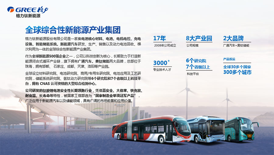 作為全球新能源500強(qiáng)企業(yè)之一,公司以科技創(chuàng)新為核心,長期致力于打造新能源閉合式循環(huán)產(chǎn)業(yè)鏈,旗下?lián)碛袕V通汽車、奧鈦儲能兩大品牌,總部位于珠海,擁有邯鄲、 石家莊、成都、天津、洛陽等產(chǎn)業(yè)園。