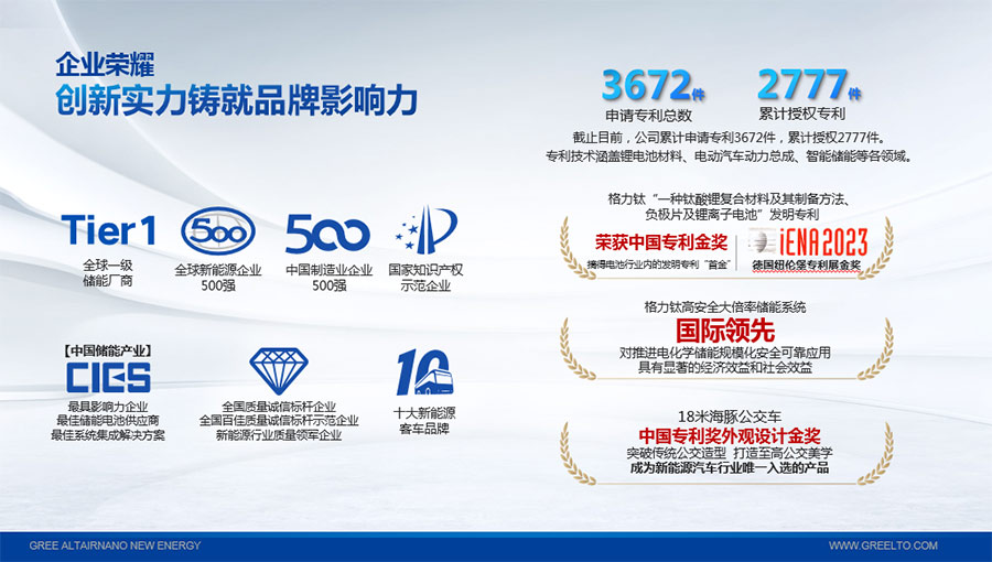 2022年,“一種鈦酸鋰復(fù)合材料及其制備方法、負(fù)極片及鋰離子電池”發(fā)明專利獲得中國專利金獎,摘得鋰電池行業(yè)內(nèi)的發(fā)明專利“首金”;2023年,該專利技術(shù)再次斬獲第75屆德國紐倫堡發(fā)明國際金獎。“高安全大倍率儲能系統(tǒng)關(guān)鍵技術(shù)研發(fā)與應(yīng)用”項(xiàng)目被中國機(jī)械工業(yè)聯(lián)合會鑒定達(dá)到“國際領(lǐng)先”水平。截至目前,格力鈦先后獲得“中國民營企業(yè)制造業(yè)500強(qiáng)”、“全國質(zhì)量信得過產(chǎn)品”、“客車安全技術(shù)成果獎”、“中國儲能產(chǎn)業(yè)最具影響力企業(yè)獎、最佳系統(tǒng)集成商、最佳儲能電池供應(yīng)商”等榮譽(yù),獲得工信部頒發(fā)的“綠色工廠”榮譽(yù)稱號;上榜科技部發(fā)布的新能源領(lǐng)域獨(dú)角獸企業(yè),多年入選全球新能源企業(yè)500強(qiáng),入選“全國百佳質(zhì)量檢驗(yàn)誠信標(biāo)桿企業(yè)”、“國家知識產(chǎn)權(quán)優(yōu)勢企業(yè)”等。