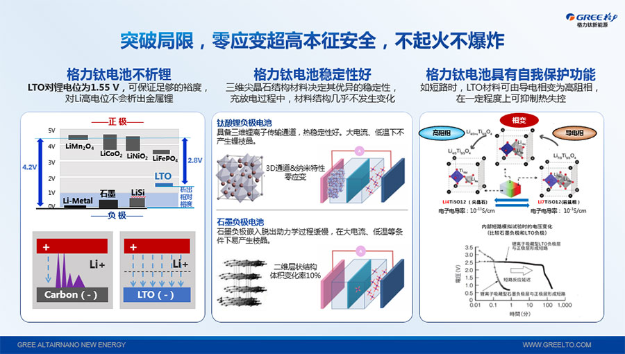 鈦酸鋰電池技術(shù)是新能源行業(yè)唯一獲得中國專利獎金獎的鋰電池產(chǎn)品技術(shù),其應(yīng)用于儲能電池和動力電池具有超高安全性,在快充放、耐寬溫、長壽命等方面同樣具有卓越的性能。格力鈦電池系列產(chǎn)品具有不起火不爆炸高安全、6分鐘快充放、-50℃至60℃耐寬溫特性,循環(huán)充放電次數(shù)高達(dá)30000多次,使用壽命長達(dá)30年。格力鈦電池經(jīng)利鋸切割、尖針穿刺、強(qiáng)力擠壓、電鉆沖孔、短路充放電、高溫加熱、槍擊等極限條件測試,均未發(fā)生冒煙、起火、燃燒、爆炸等現(xiàn)象。