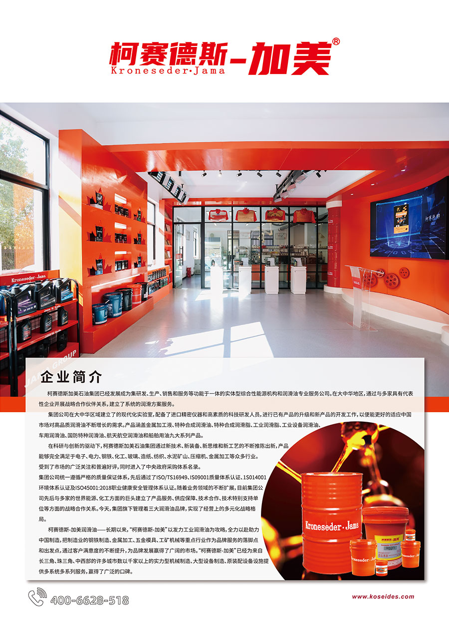 主要產(chǎn)品:柯賽德斯-加美Kroneseder?Jama、中訊高科ZHONGXUN、柯賽德Kroneseder三大品牌,產(chǎn)品涵蓋金屬加工油液、特種合成潤滑油、特種合成潤滑脂、工業(yè)潤滑脂、工業(yè)設(shè)備潤滑油、車用潤滑油、國防特種潤滑油、航天航空潤滑油和船舶用油九大系列產(chǎn)品