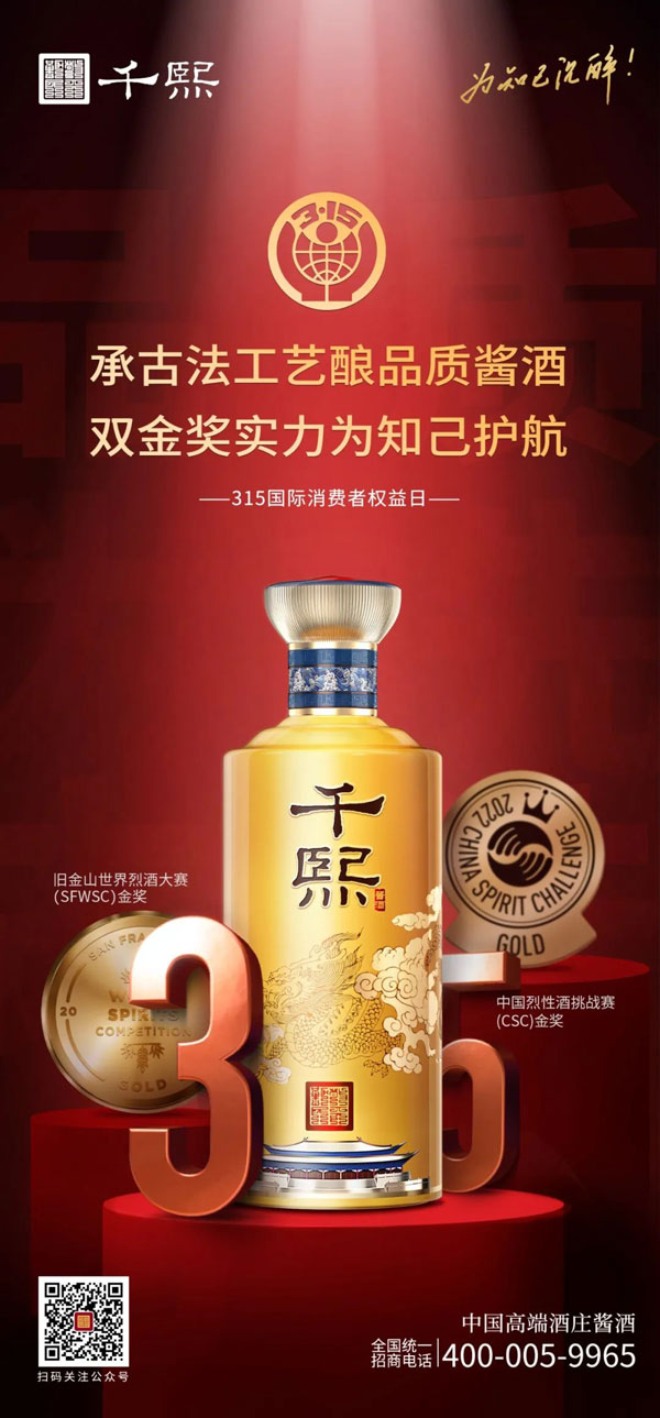每一年的315消費(fèi)者權(quán)益日,大眾對食品安全,消費(fèi)安全總是格外敏感。作為一家以“抱樸守真 一諾千年”為品質(zhì)理念的醬酒企業(yè),從“舊金山世界烈酒大賽金獎”到榮獲“CSC 中國烈性酒挑戰(zhàn)賽金獎”等稱號,千熙酒業(yè)始終不忘初心,以消費(fèi)者至上為宗旨,以品牌為責(zé)任,為消費(fèi)者打造品質(zhì)以恒持的一杯好酒。