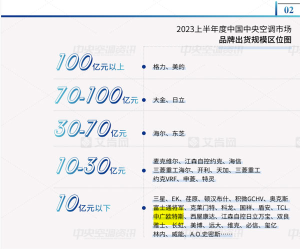 經過多年的發(fā)展,中國中央空調市場的品牌格局基本穩(wěn)定。結合2023上半年各品牌的市場表現,該報告將品牌出貨規(guī)模區(qū)位分為5大陣營,其中,中廣歐特斯在10億元以下規(guī)模榜上有名。