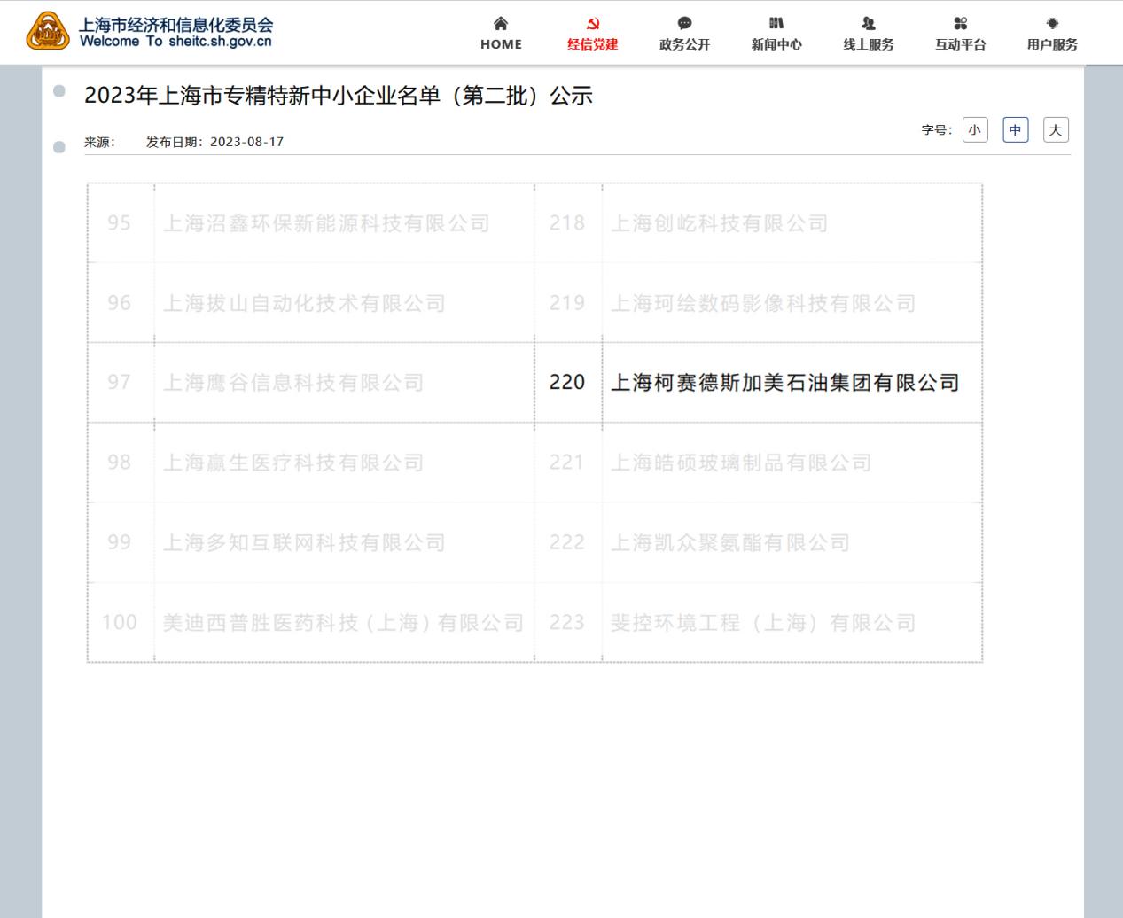 柯賽德斯加美石油集團進入“上海市專精特新”名錄