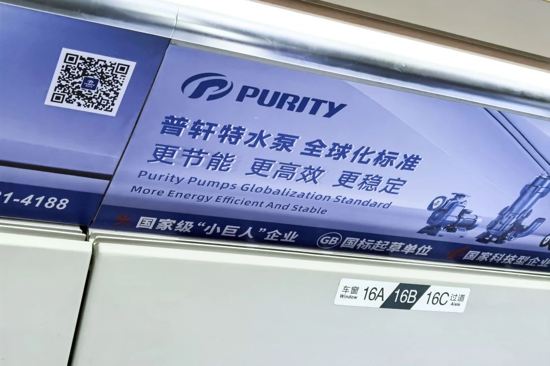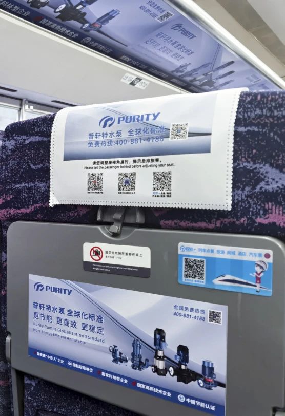“普軒特號”高鐵專列以“普軒特水泵,全球化標(biāo)準(zhǔn)”為主旨,在車廂內(nèi)以全面覆蓋的宣傳形式,將專列打造成展示普軒特形象的“移動展廳”,深度刻畫普軒特對全球標(biāo)準(zhǔn)的堅(jiān)定態(tài)度