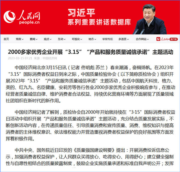 中國經(jīng)濟(jì)網(wǎng):2000多家優(yōu)秀企業(yè)開展“3·15”“產(chǎn)品和服務(wù)質(zhì)量誠信承諾”主題活動(dòng)