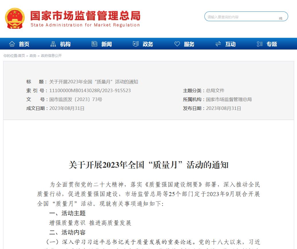 市場(chǎng)監(jiān)管總局等25個(gè)部門共同發(fā)布《關(guān)于開展2023年全國"質(zhì)量月"活動(dòng)的通知》發(fā)布