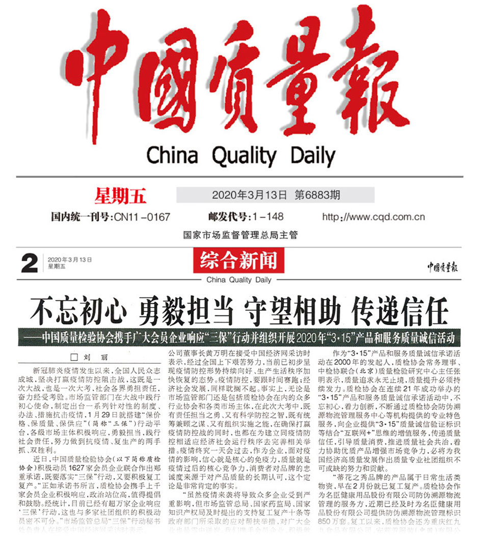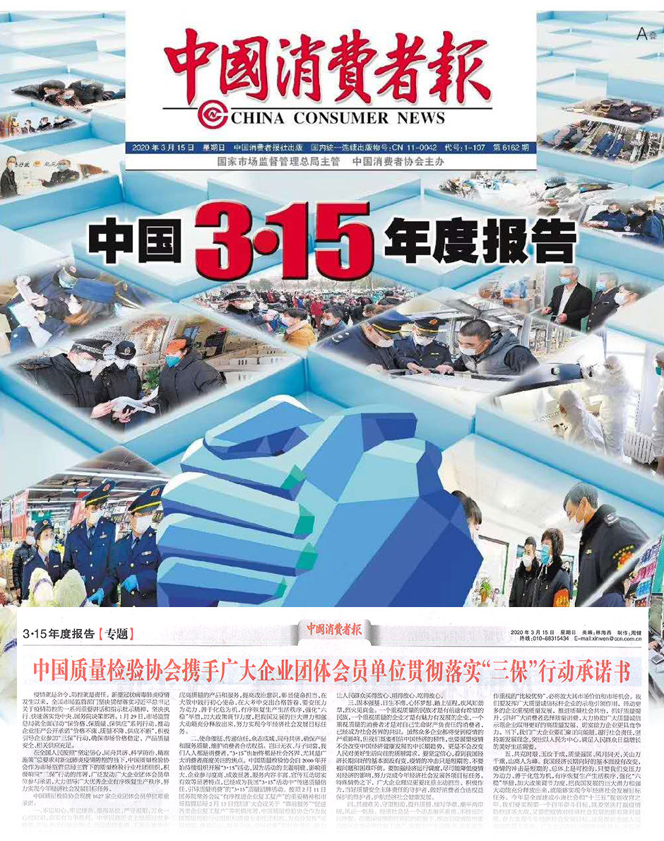 中國質量報《不忘初心 勇毅擔當 守望相助 傳遞信任——中國質量檢驗協(xié)會攜手廣大會員企業(yè)響應“三?!毙袆硬⒔M織開展2020年“3·15”產品和服務質量誠信活動》