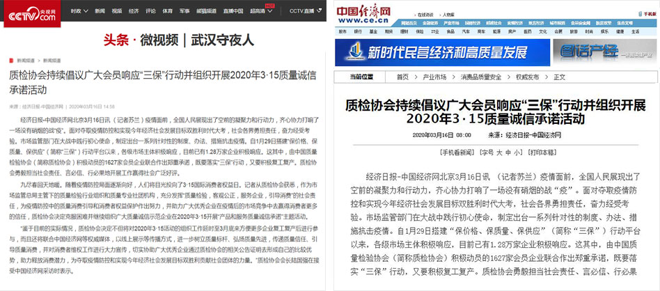 中國經濟網《質檢協(xié)會持續(xù)倡議廣大會員響應“三保”行動并組織開展2020年3·15質量誠信承諾活動》