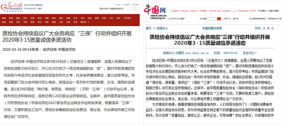 人民網《質檢協(xié)會持續(xù)倡議廣大會員響應“三保”行動并組織開展2020年3·15質量誠信承諾活動》