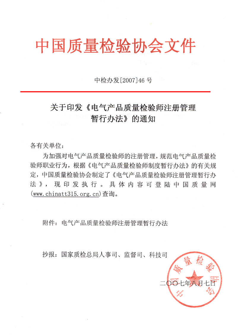 關(guān)于印發(fā)《電氣產(chǎn)品質(zhì)量檢驗師注冊管理暫行辦法》的通知