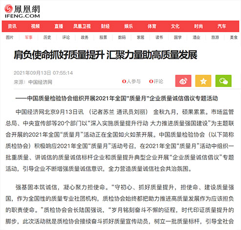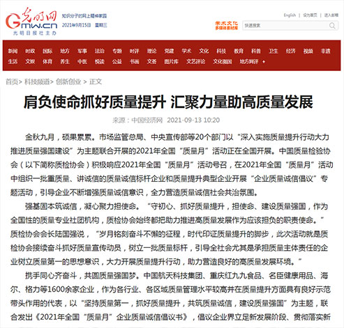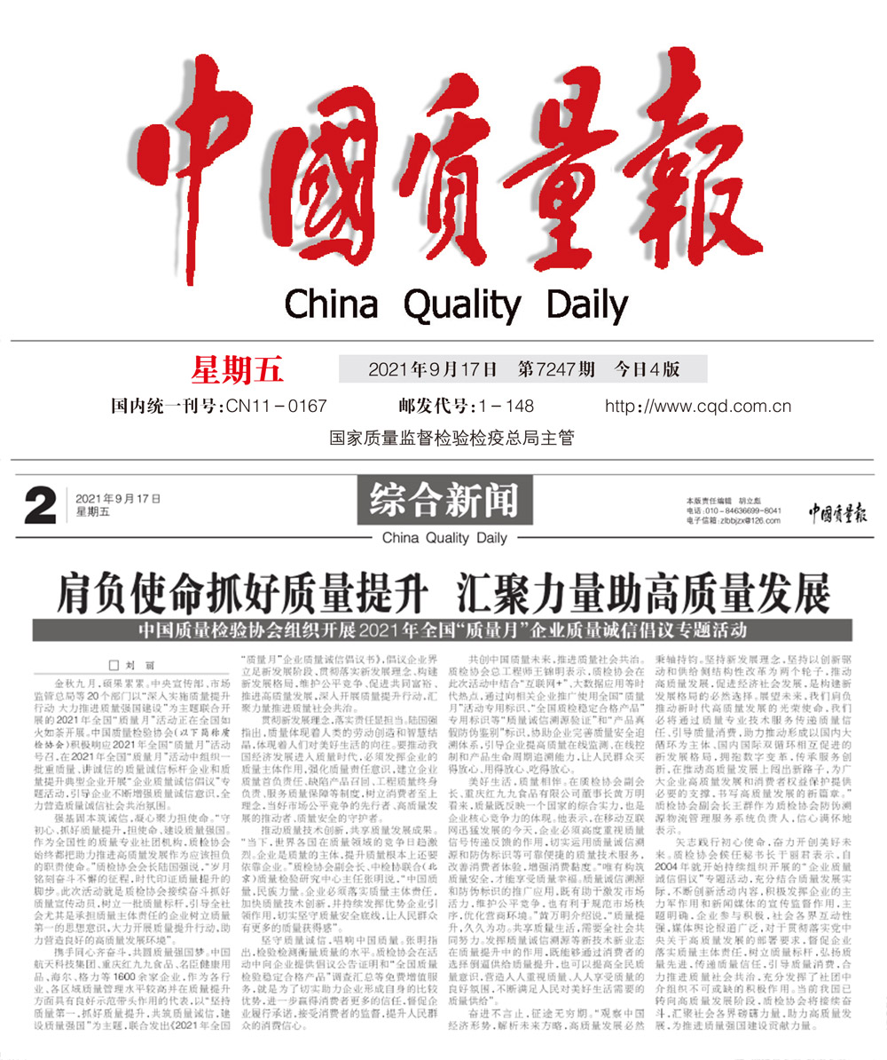 中國(guó)質(zhì)量報(bào):肩負(fù)使命抓好質(zhì)量提升匯聚力量助高質(zhì)量發(fā)展——中國(guó)質(zhì)量檢驗(yàn)協(xié)會(huì)組織開(kāi)展2021年全國(guó)“質(zhì)量月”企業(yè)質(zhì)量誠(chéng)信倡議專題活動(dòng)