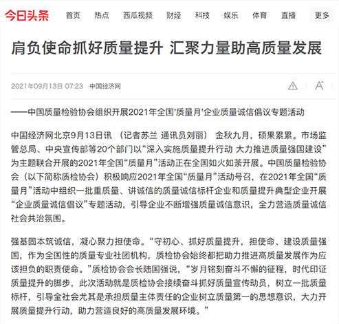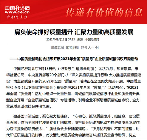 中國(guó)經(jīng)濟(jì)網(wǎng):堅(jiān)持質(zhì)量第一 抓好質(zhì)量提升 共筑質(zhì)量誠(chéng)信 建設(shè)質(zhì)量強(qiáng)國(guó)——2021年全國(guó)“質(zhì)量月”企業(yè)質(zhì)量誠(chéng)信倡議書