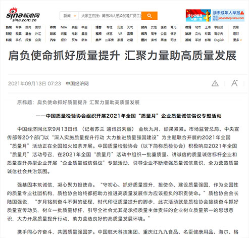 新浪網(wǎng):肩負(fù)使命抓好質(zhì)量提升 匯聚力量助高質(zhì)量發(fā)展——中國(guó)質(zhì)量檢驗(yàn)協(xié)會(huì)組織開(kāi)展2021年全國(guó)“質(zhì)量月”企業(yè)質(zhì)量誠(chéng)信倡議專題活動(dòng)