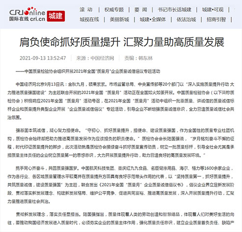 中央廣播電視總臺(tái)國(guó)際在線:肩負(fù)使命抓好質(zhì)量提升 匯聚力量助高質(zhì)量發(fā)展——中國(guó)質(zhì)量檢驗(yàn)協(xié)會(huì)組織開(kāi)展2021年全國(guó)"質(zhì)量月"企業(yè)質(zhì)量誠(chéng)信倡議專題活動(dòng)